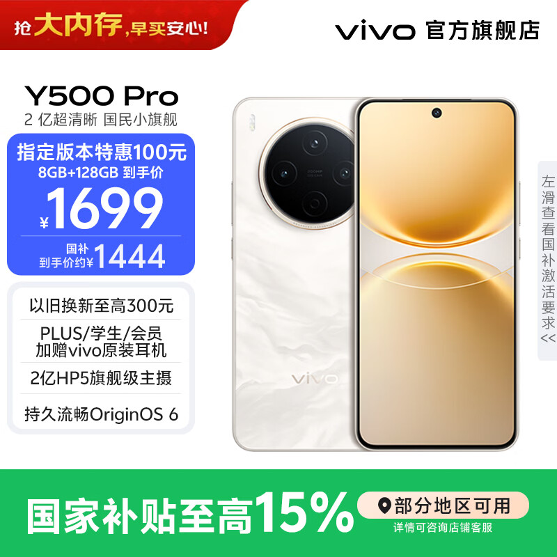 vivo Y500 Pro 2亿HP5旗舰级主摄 持久流畅OriginOS 6 十倍时长IP68+IP69防水 国家补贴 新品手机 祥云金 8GB+256GB 官方标配
