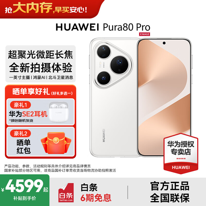 HUAWEI Pura 80 Pro 国家补贴 新品旗舰华为手机 p80pro 一英寸主摄拍照 AI辅助构图 华为鸿蒙智能手机 釉白 12GB+512GB 官方标配