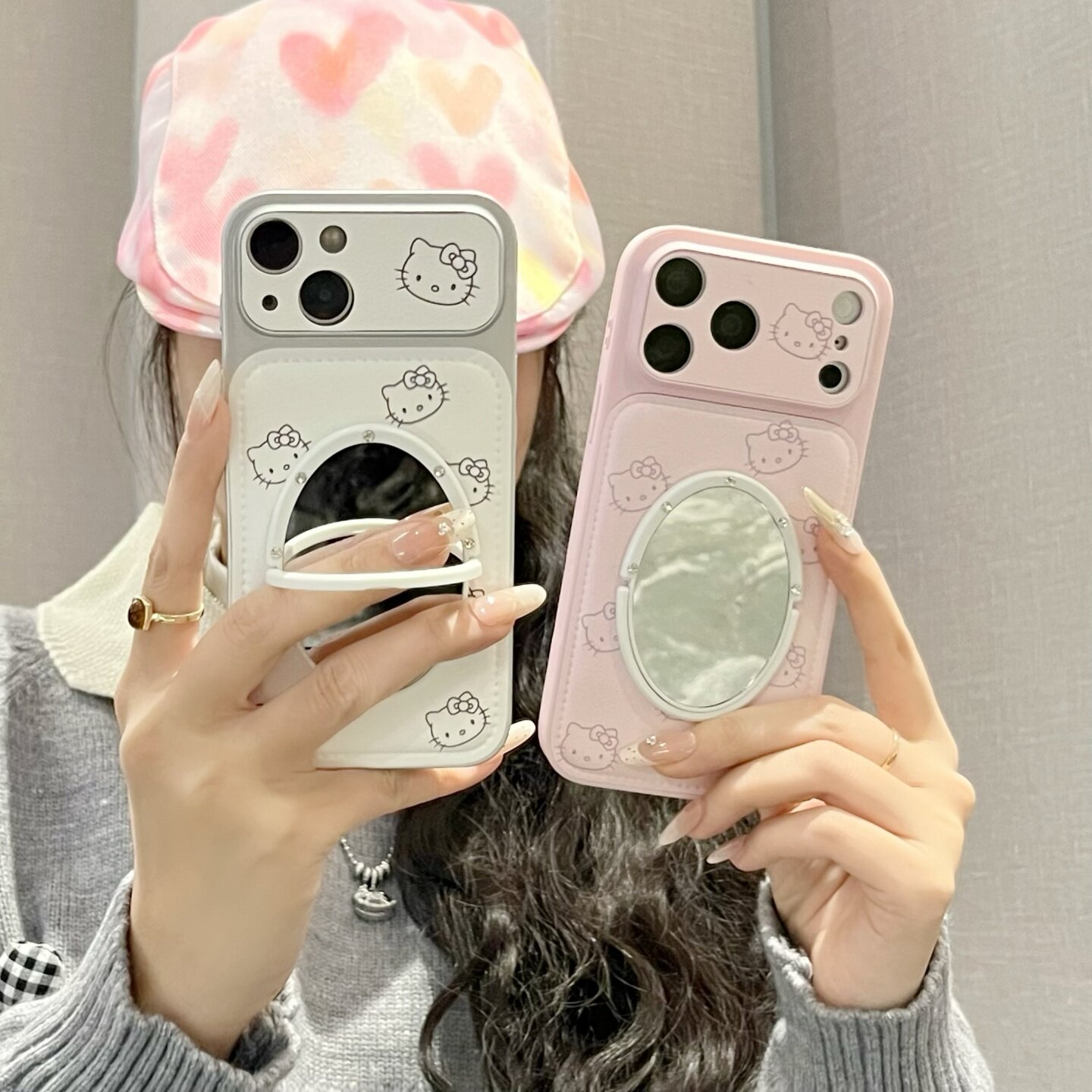 大视窗皮质适用iphone16/17promax镜子手机壳白色猫咪苹果14/15promax保护壳粉色皮纹新款卡通贴皮软壳16pro