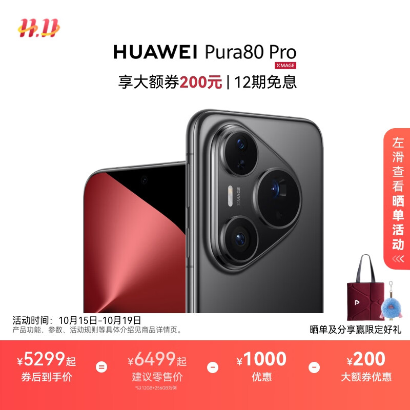 HUAWEI Pura 80 Pro 一英寸主摄 个性色卡 AI 辅助构图 华为鸿蒙智能手机 釉黑 12GB+512GB
