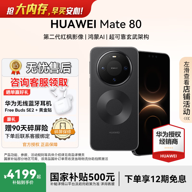 HUAWEI Mate 80 华为mate80手机 第二代红枫影像鸿蒙AI 华为直屏鸿蒙手机 麒麟芯片 官方正品 全新 曜石黑 12GB+512GB 官方正品 全网通 赠碎屏险 全国联保