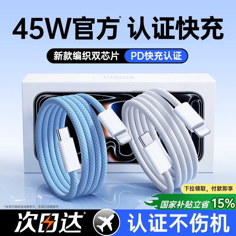 第一卫适用苹果14充电线iphone17promax数据线快充13pro手机12PD45W编织长16typec转lighting平板iPad车载USB