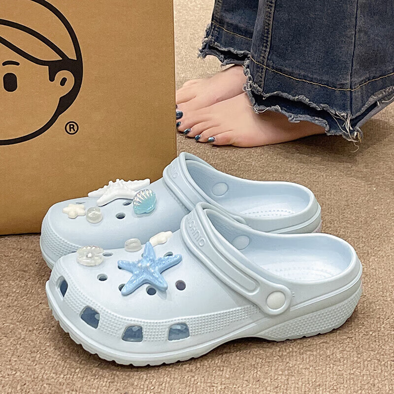 洁丽雅(Grace)洞洞鞋女款夏季2026新款户外防滑沙滩凉鞋防臭透气包头拖鞋男外穿 天空蓝+贝壳海星(8个) 38-39 【标准码】