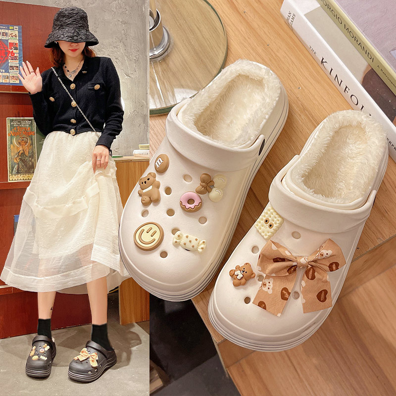 厚底防水加绒洞洞鞋女冬居家防滑外穿厚底韩版ins甜美包头棉拖鞋