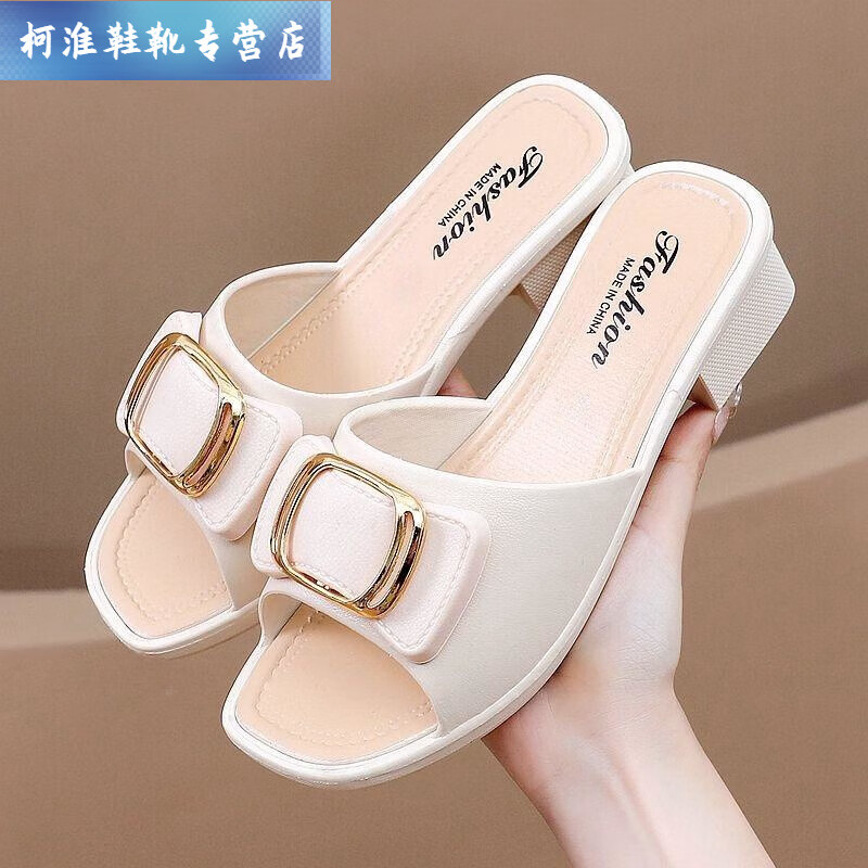 俪韵小屋(LiYunHouSe)高跟拖鞋夏季外穿软底凉鞋防滑女士一字韩版百搭时尚厚 米白色 38-39 鞋子偏小一码