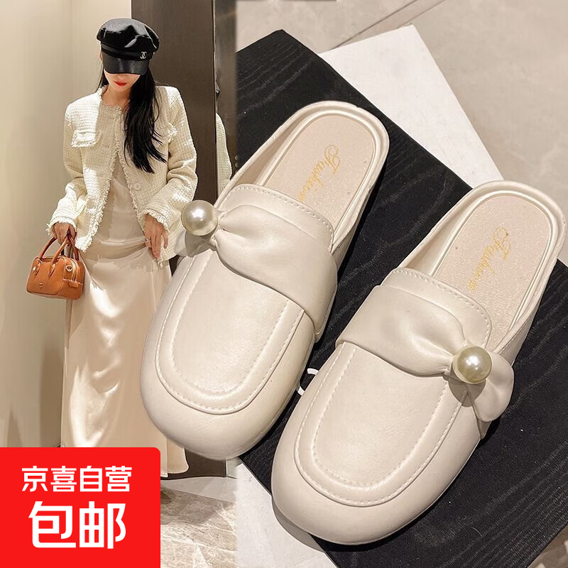 2025夏季新款拖鞋女包头鞋时尚个性软底防滑珍珠包头外穿半拖鞋女 米白色 38-39 偏小