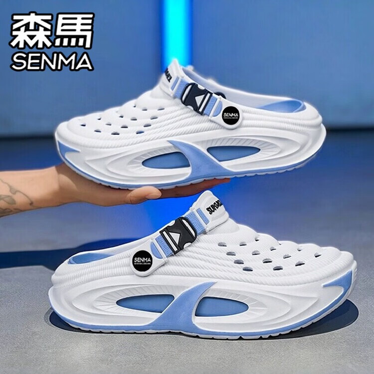 森馬洞洞鞋男夏季新款外穿防滑耐磨厚底包头拖鞋踩屎感开车沙滩凉鞋男 白蓝 【基础款】 42 (42-43 同码)
