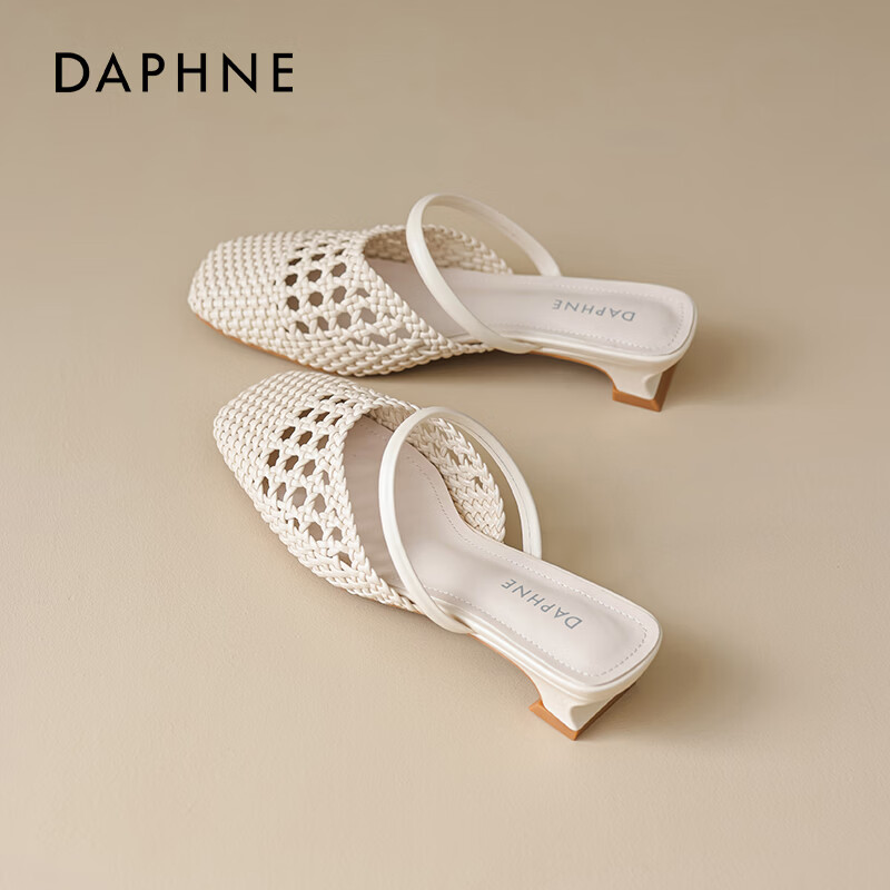 达芙妮编织包头半拖鞋女2026春夏新款透气凉拖米色百搭一脚蹬凉鞋配裙子