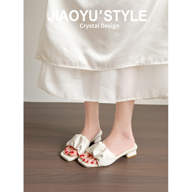 真皮~骄屿云朵凉拖鞋女夏外穿2026新款粗高跟法式沙滩一字半拖鞋