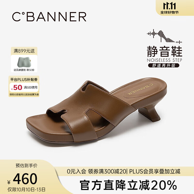 千百度【静音系列】粗高跟羊皮凉拖鞋女款2025夏季拖鞋 棕色 38 (240mm)