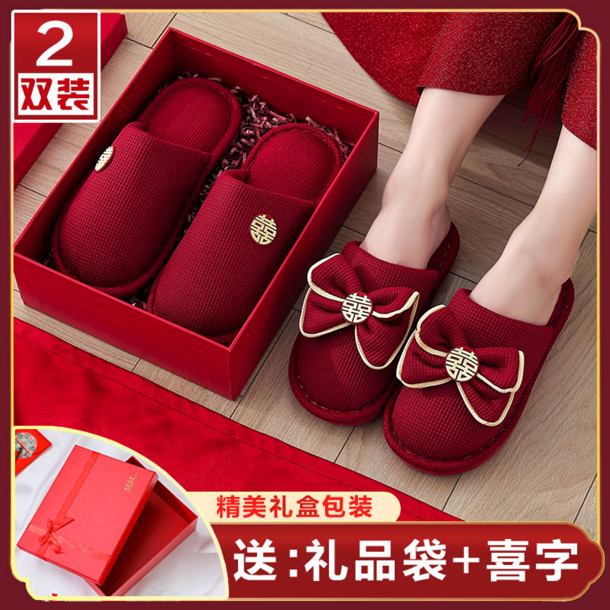 结婚拖鞋婚庆红色喜庆高级新郎新娘情侣新婚轻奢一对冬季陪嫁晨袍
