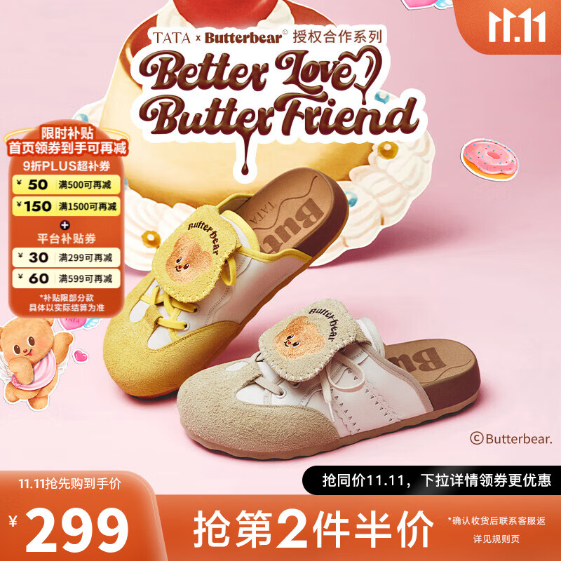 他她(TATA)女鞋勃肯鞋黄油小熊联名秋季厚底女外穿包头拖鞋 米白/杏 37
