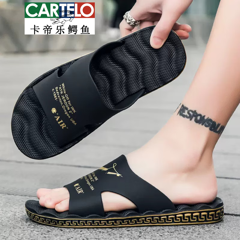 卡帝乐鳄鱼(CARTELO)男士拖鞋夏季外穿防滑户外一字拖男款运动凉拖鞋外出凉拖鞋男新品 黑金 41 标准运动码