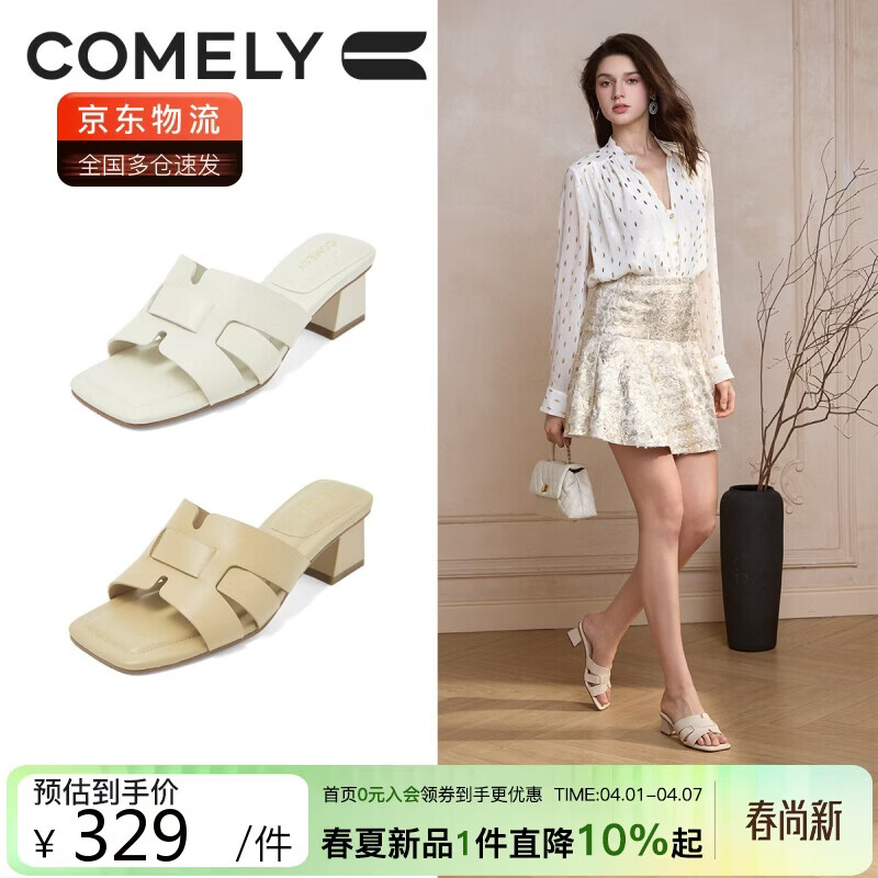 康莉(COMELY)羊皮粗跟拖鞋女夏季新款方头编织百搭外穿女士凉拖鞋 奶油白 38