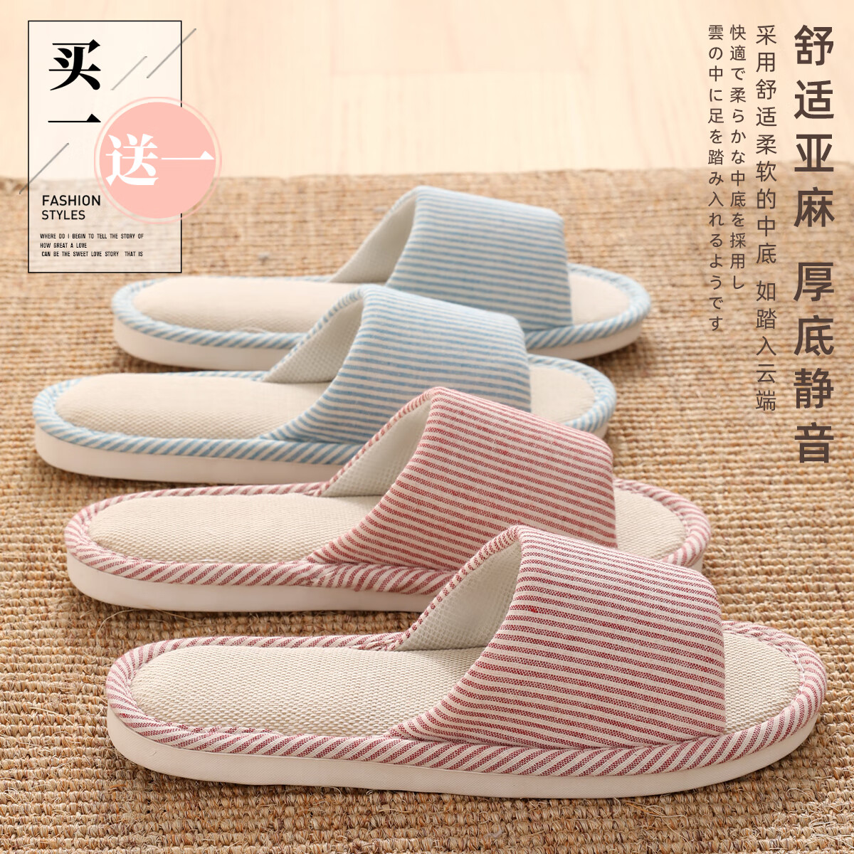 洁丽雅【2双装】亚麻拖鞋女夏季室内居家用吸汗防臭静音情侣凉拖鞋四季 大红+天蓝 38-39 女+42-43男