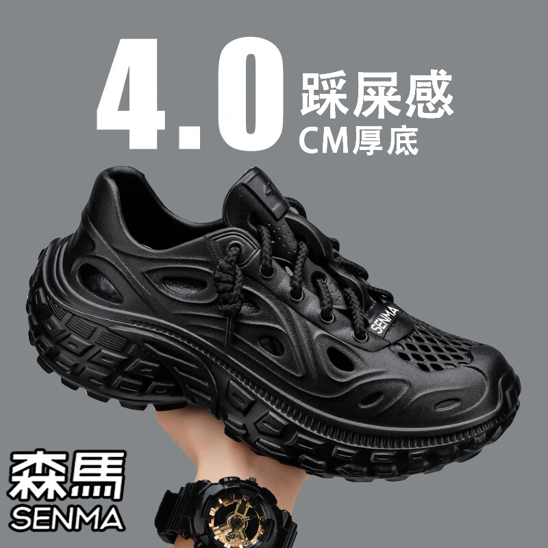森馬拖鞋男款夏季外穿潮流黑色踩屎感洞洞鞋男士软底运动耐磨沙滩凉鞋 黑色 42