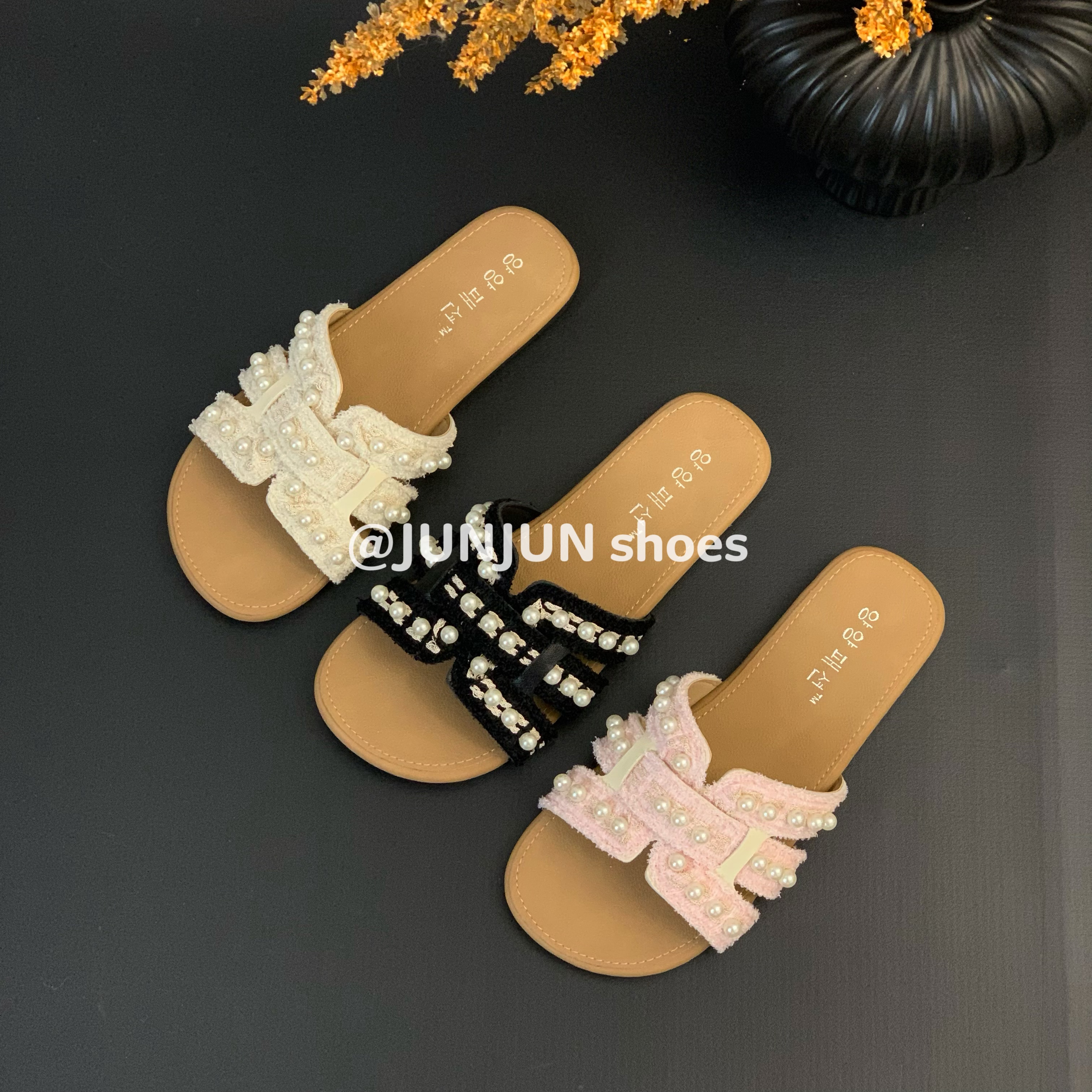2026新款珍珠法式沙滩平底一字拖夏季小香风平底时尚百搭凉拖鞋