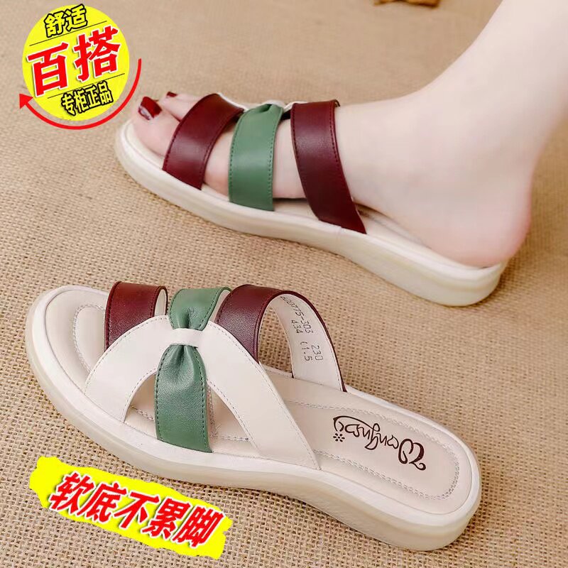 品牌断码真软皮软底一字拖女夏季拼色防滑轻便百搭凉拖鞋