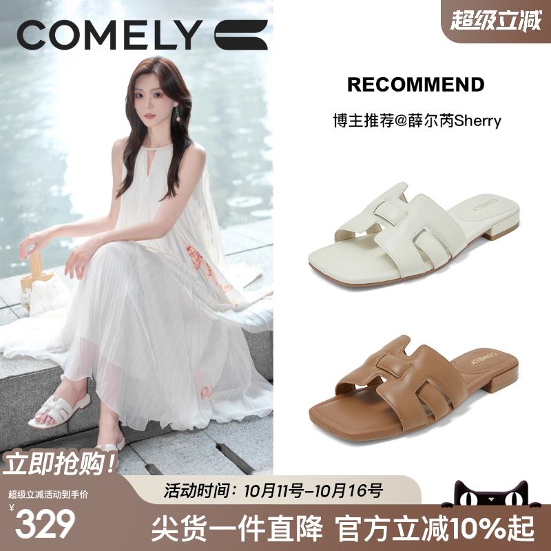 康莉真皮平底拖鞋女2025夏季新款舒适百搭可外穿粗跟一字拖女鞋子