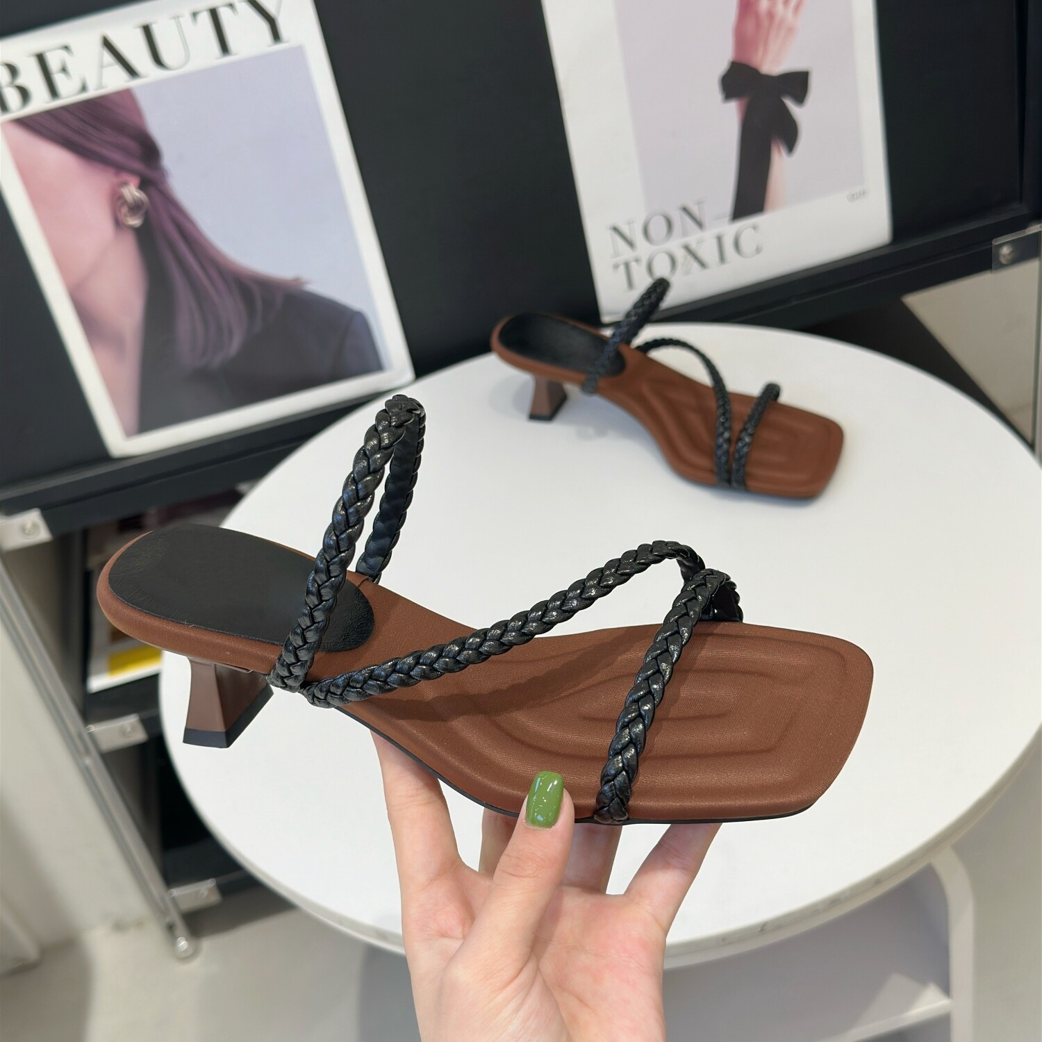 复古编织细带一字拖女夏外穿2026新款法式方头细跟度假风沙滩拖鞋