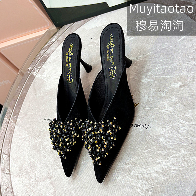 夏日包头拖太心动了!绝美2026超火半拖尖头高跟水钻外穿真皮拖鞋