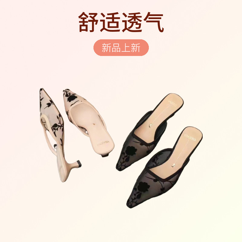 专柜正品包头拖鞋女2024夏季网纱镂空民族风蕾丝尖头凉拖鞋310581