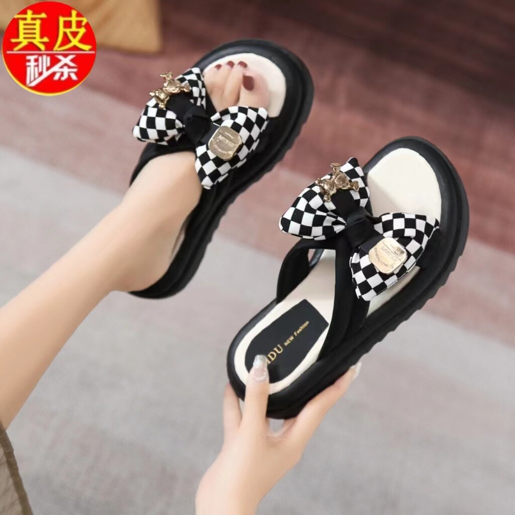 品牌正品小香风真皮凉拖鞋女2026新夏季外穿厚底防滑蝴蝶结一字拖