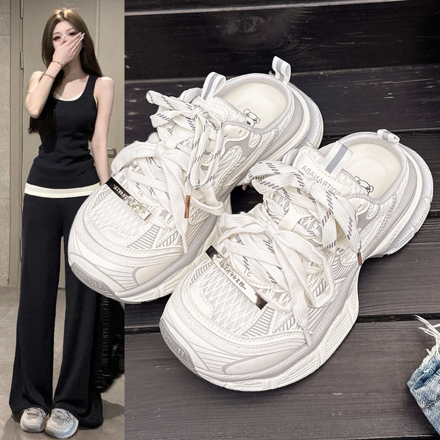 包头网面半拖鞋女2026新款百搭厚底内增高小个子一脚蹬懒人小白鞋