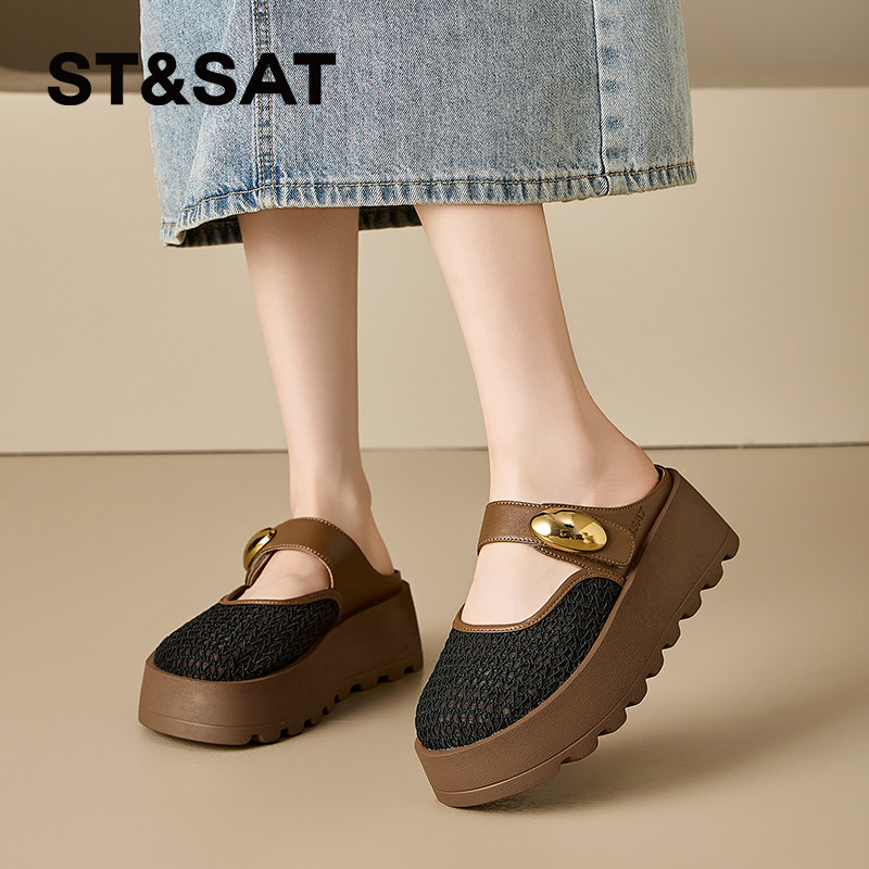 星期六厚底镂空包头半拖鞋女款夏季新款增高配裙子外穿休闲凉拖鞋
