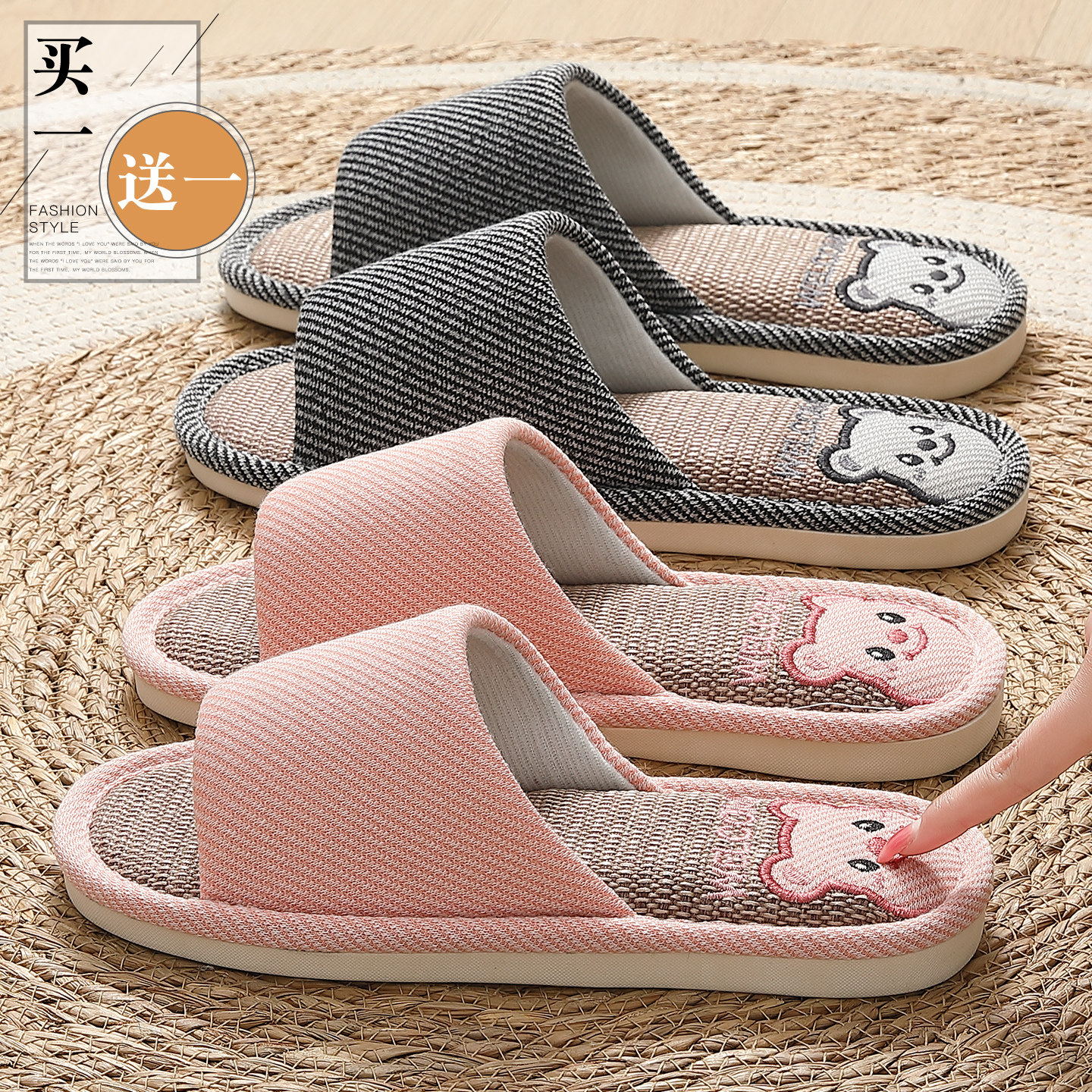 买1送1小熊亚麻拖鞋女士室内家居情侣一对静音防滑四季棉麻拖鞋男