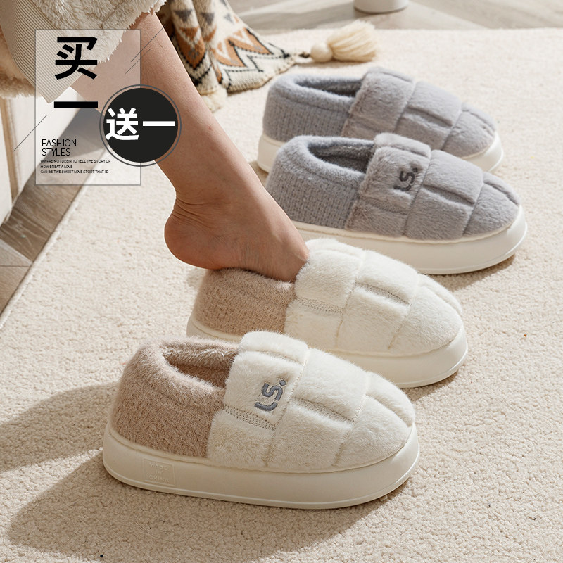 买一送一棉拖鞋女复古格纹冬季保暖家居室内情侣防滑家用毛绒拖鞋