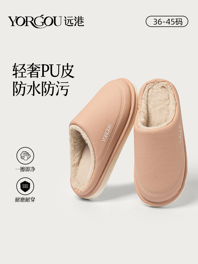远港防水棉拖鞋女士秋冬季家居家用毛绒保暖室内高级感PU皮拖鞋男