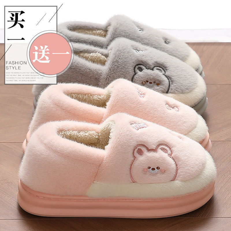 买1送1棉拖鞋女士包跟冬季室内家居情H侣一对厚底毛绒保暖棉鞋男