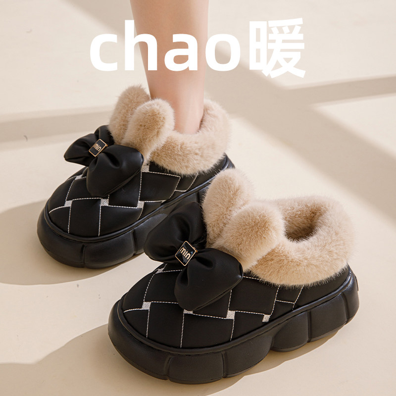 厚底蝴蝶结棉拖鞋女冬季2024新款DPU皮防水毛绒保暖包跟雪地靴外