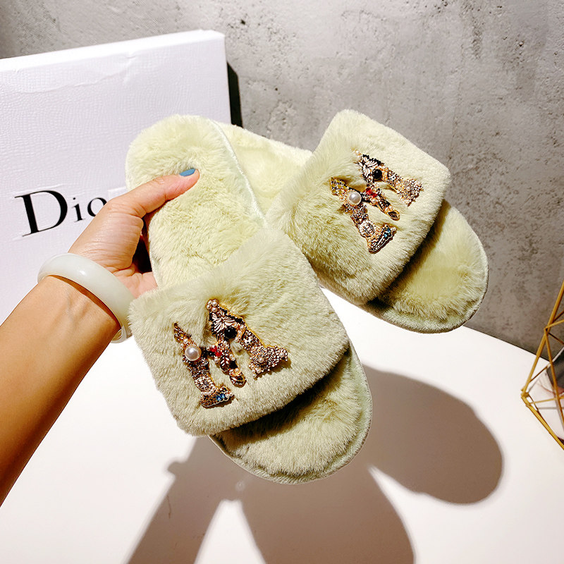 港风锆石水钻字母新款毛绒拖鞋女居家软底L防滑保暖时尚外穿棉拖