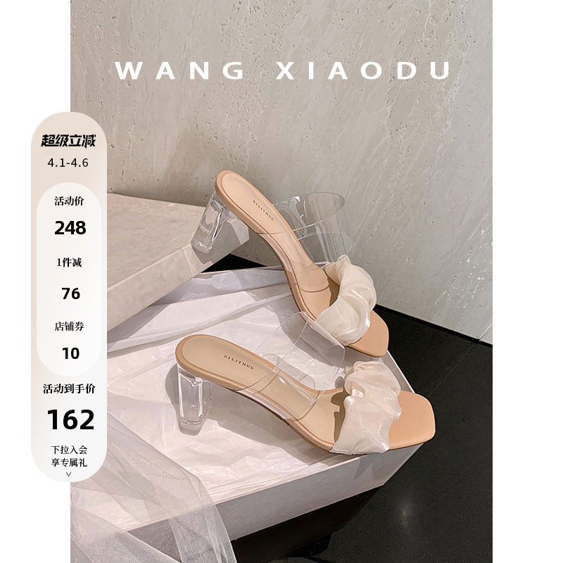 【王小毒】仙女教母●透明网纱方头拖鞋女夏季外穿新款高跟凉拖鞋