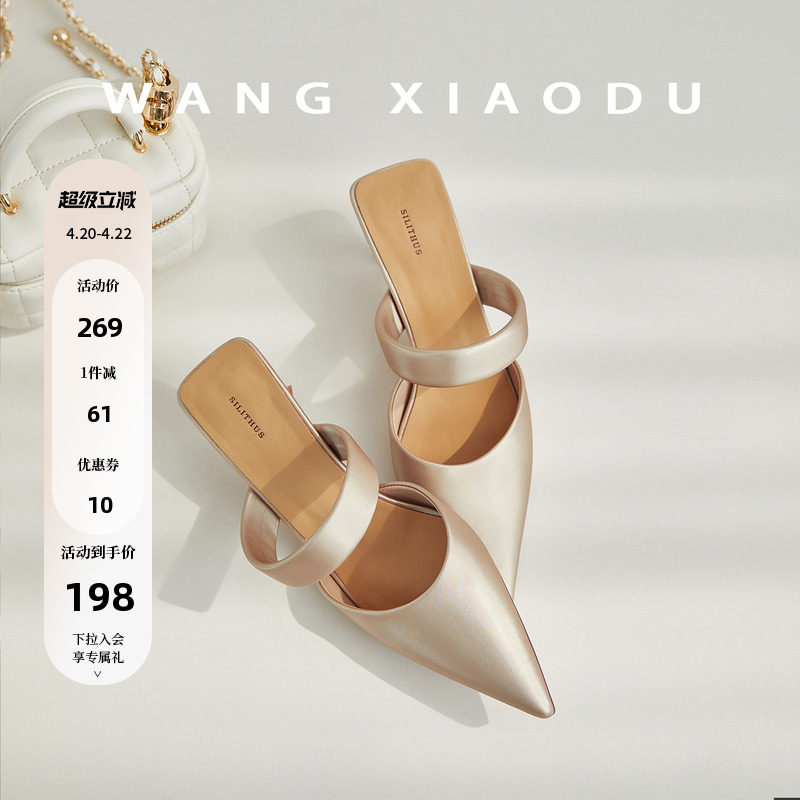 【王小毒】香槟假日●6.5cm真丝尖包头凉拖鞋女高跟一字带穆勒拖