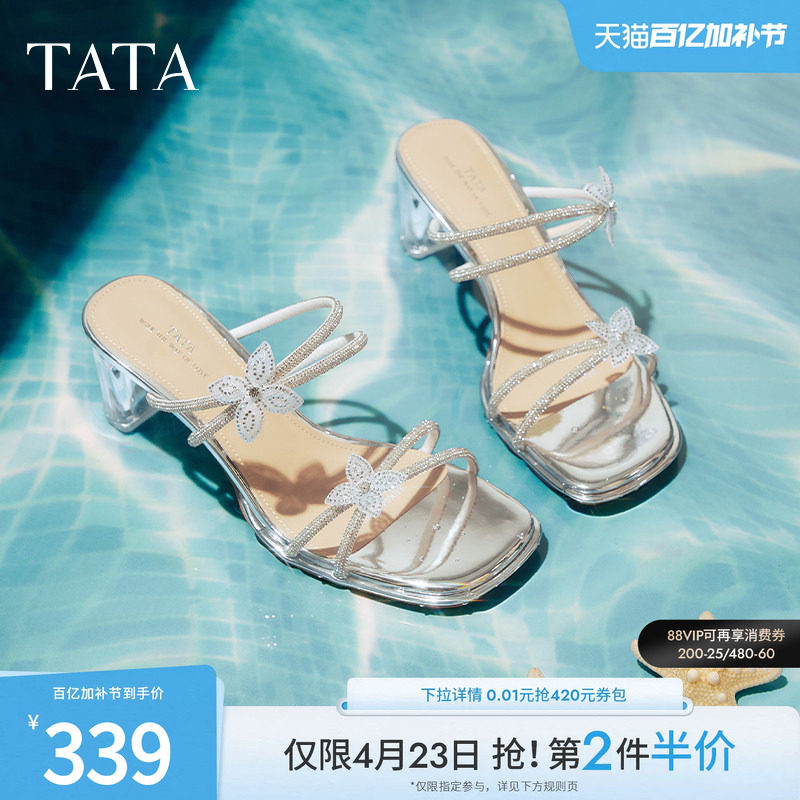 TATA他她仙女系列法式水钻高跟拖鞋女鞋气质透明底凉拖XEK04BT5