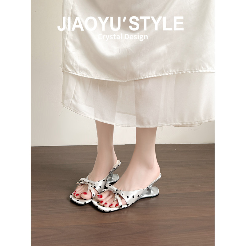 真皮~骄屿方头绝美凉拖鞋女夏外穿2026新款白色波点悬浮高跟凉鞋