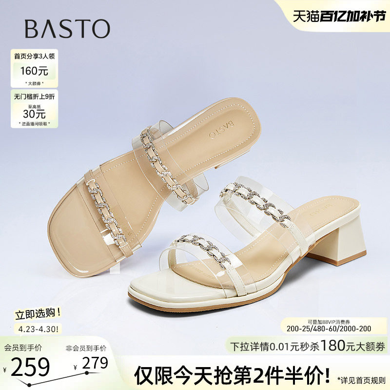 百思图夏季商场新款时尚一字拖凉拖粗跟外穿女拖鞋W3671BT5