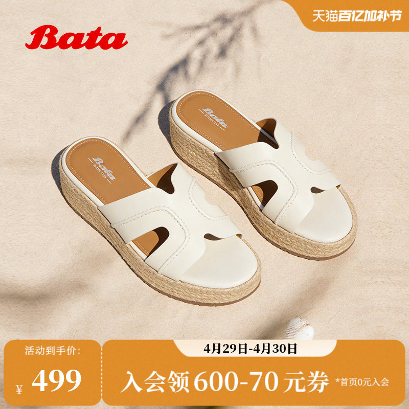 Bata波西米亚一字拖女2026夏商场新款厚底编织风度假拖鞋86017BT6