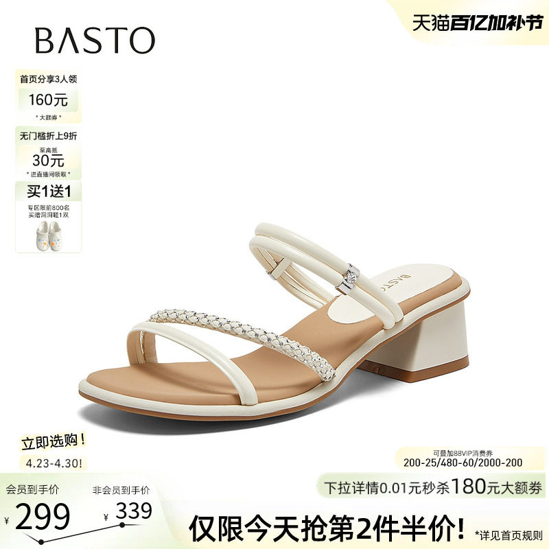 百思图2026夏新款时尚通勤圆头粗跟条带露趾凉鞋拖鞋女鞋O7989BT6