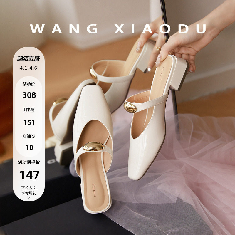 【王小毒】新月光○小金豆包头拖鞋女夏季新款漆皮粗跟穆勒单鞋