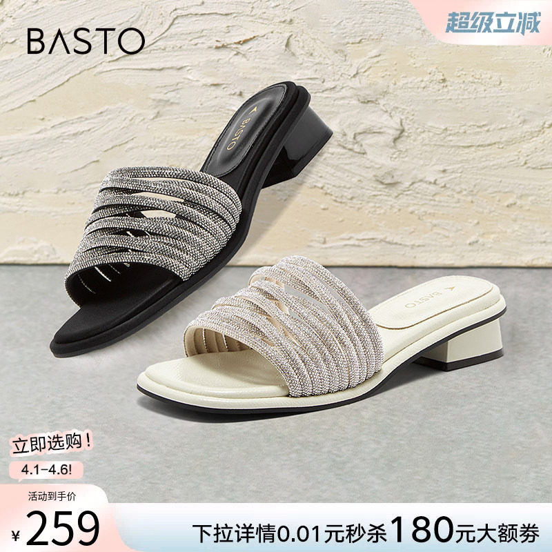 百思图夏商场新款时尚气质闪钻一字拖粗跟女外穿拖鞋A5251BT4