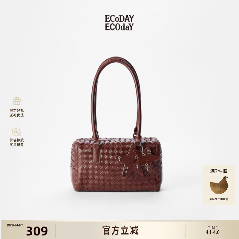 ECODAY编织包公文包单肩手提腋下包波士顿包送女友生日礼物 红棕色