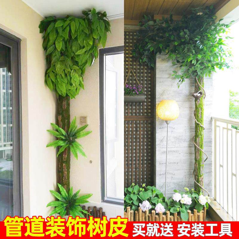 管道装饰树皮包下水管子绿植树叶遮挡柱子美化室内造景假花藤条