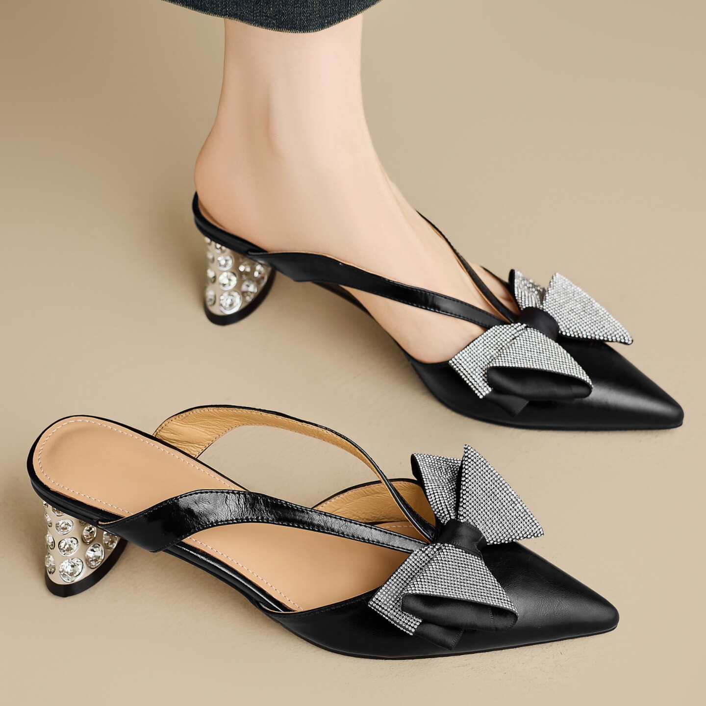 春夏牛皮尖头高跟半拖鞋女气质真皮包头水钻蝴蝶结粗跟懒人穆勒鞋
