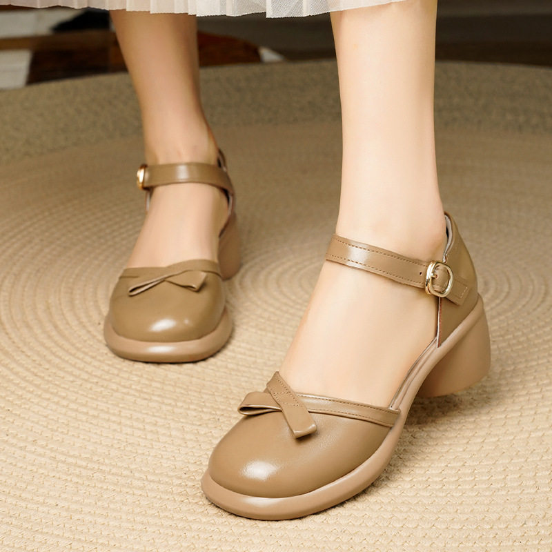 法式气质蝴蝶结粗跟芭蕾单鞋女2026夏季新款时尚名媛真皮包头凉鞋