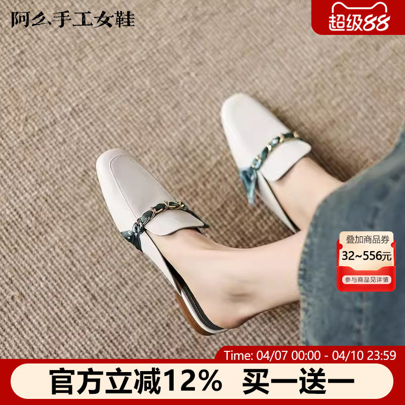 阿么手工女鞋夏季外穿百搭凉鞋低跟真皮包头半拖丝带穆勒鞋