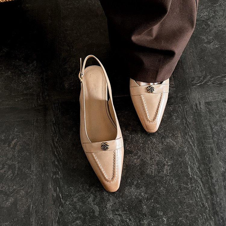 法式轻熟风真皮包头凉鞋女粗跟中跟后绊带金属扣气质杏色夏天百搭